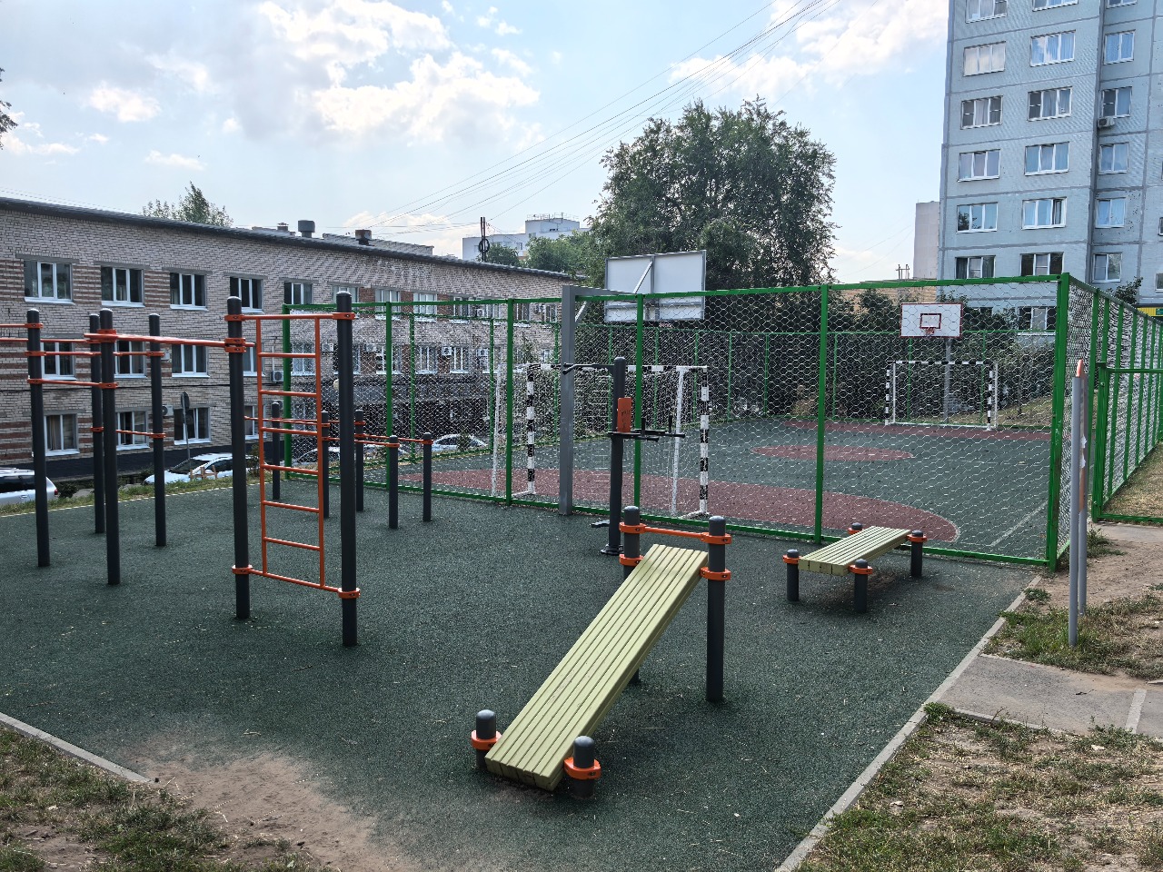 В первом случае особых нареканий не возникло – разве что нашёлся небольшой участок газона без травы. В остальном объект выглядит почти идеально – конструкции в хорошем состоянии, песочница полна песка и игрушек. Сама площадка оснащена детским игровым оборудованием, качелями и спортивными тренажёрами.