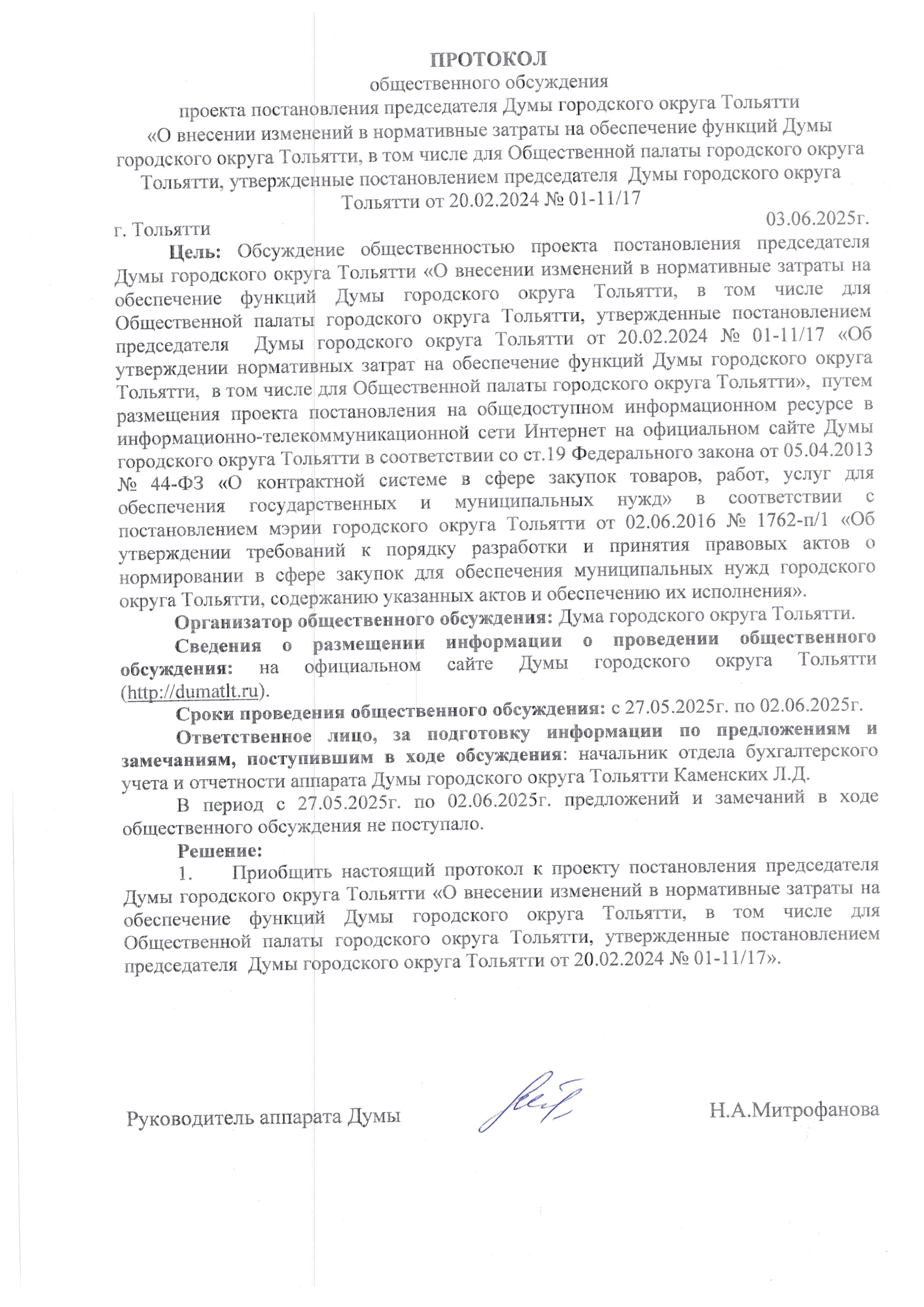 участника обсуждения к проекту постановления председателя Думы городского округа Тольятти «О внесении изменения в нормативные затраты на обеспечение функций Думы городского округа Тольятти, в том числе для Общественной палаты городского округа Тольятти, утвержденные постановлением председателя Думы городского округа Тольятти от 20.02.2024 № 01-11/17»