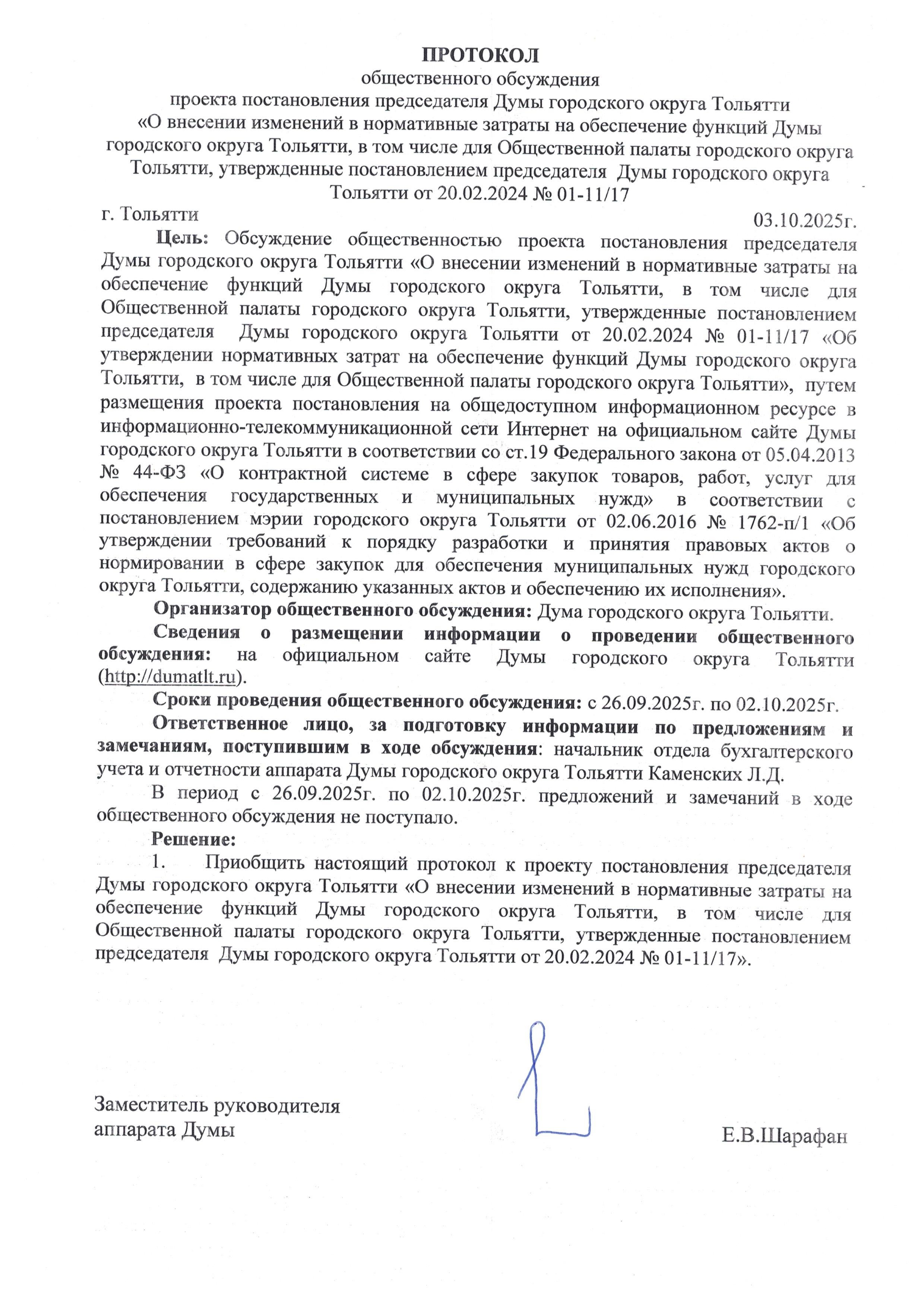 Думы городского округа Тольятти «О внесении изменений в нормативные затраты на обеспечение функций Думы городского округа Тольятти, в том числе для Общественной палаты городского округа Тольятти, утвержденные постановлением председателя Думы городского округа Тольятти от 20.02.2024 № 01-11/17»